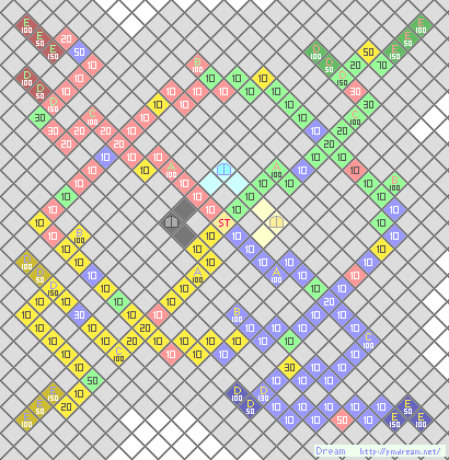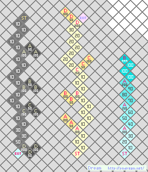|  ※服の色によってポイント数は0.5倍、1.5倍に変動します。 ※色が濃い部分は隠しマス。解禁した曲をプレイしたりすると出現。  ※左から「闇の世界」「光の世界」「無の世界」